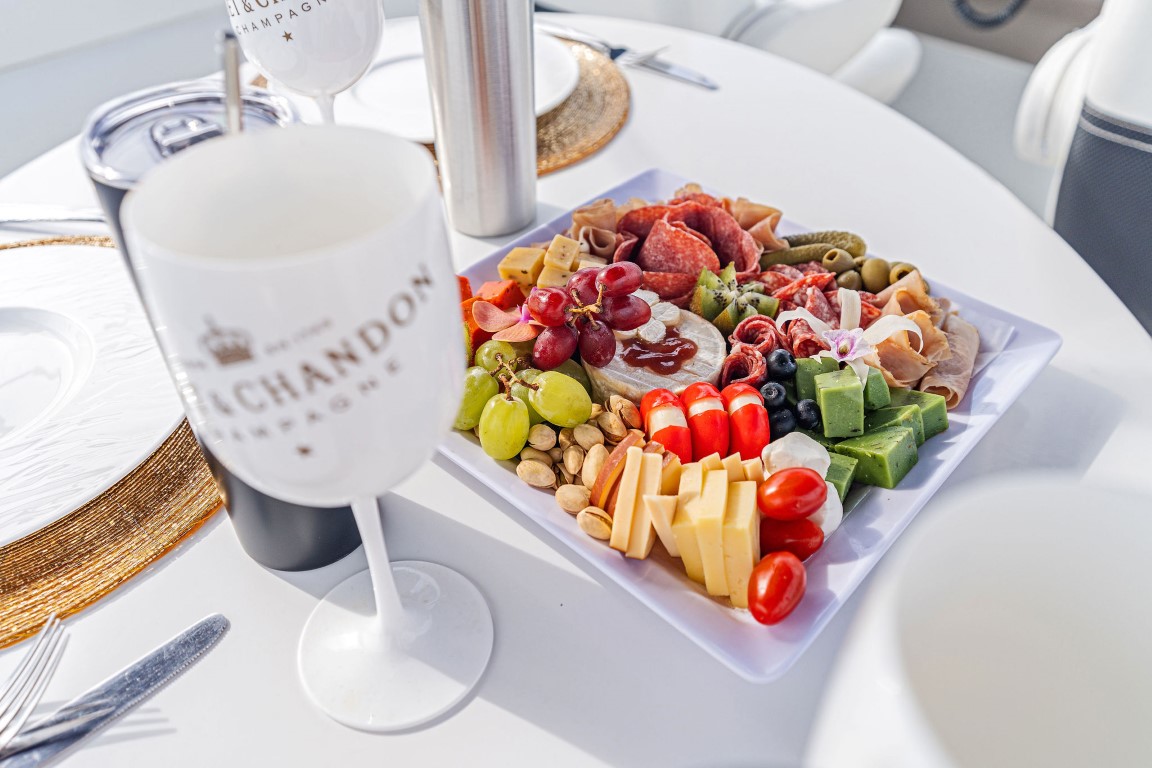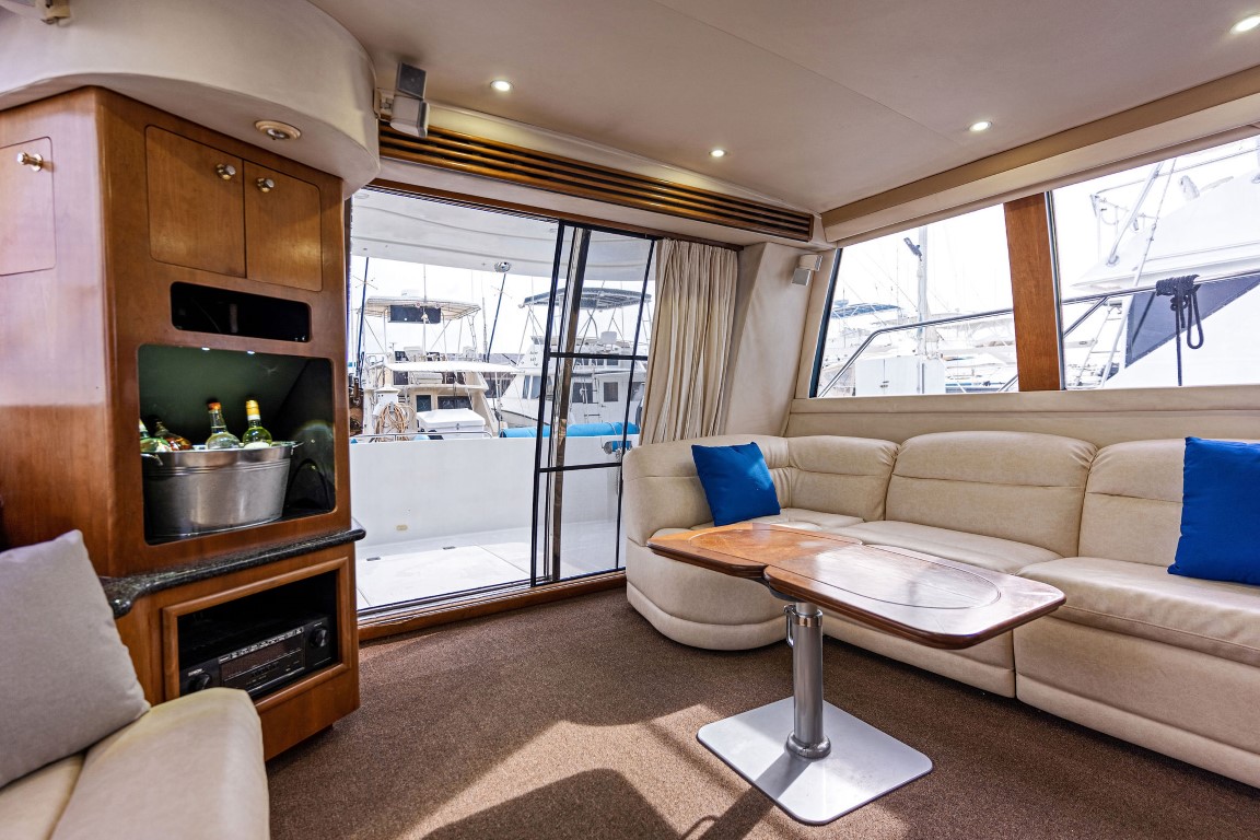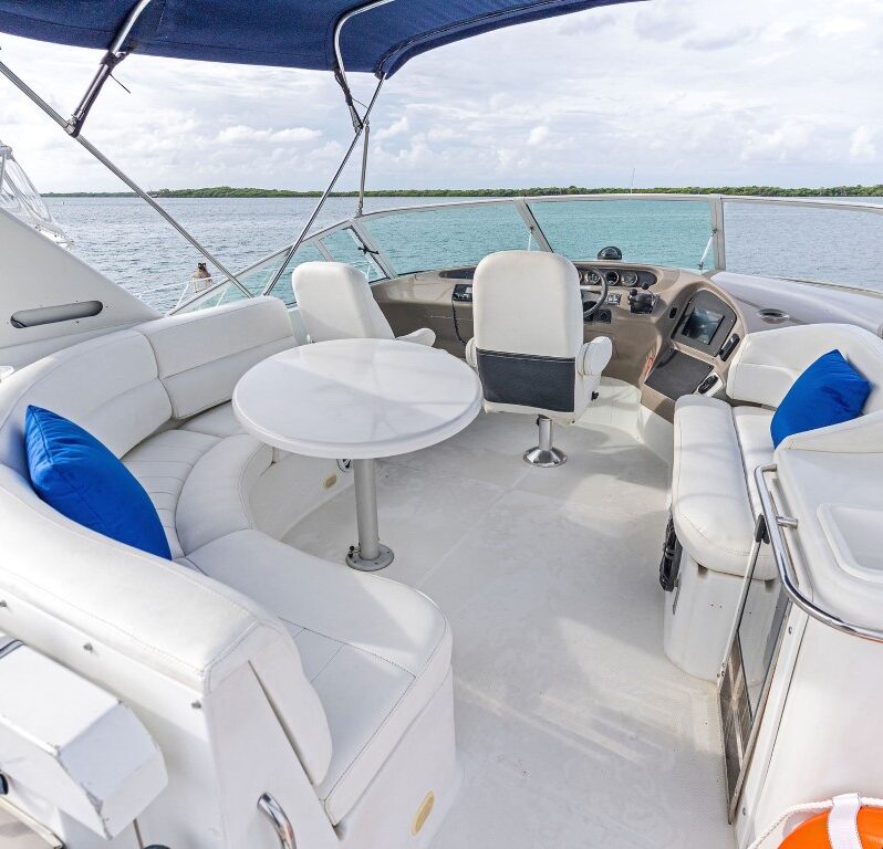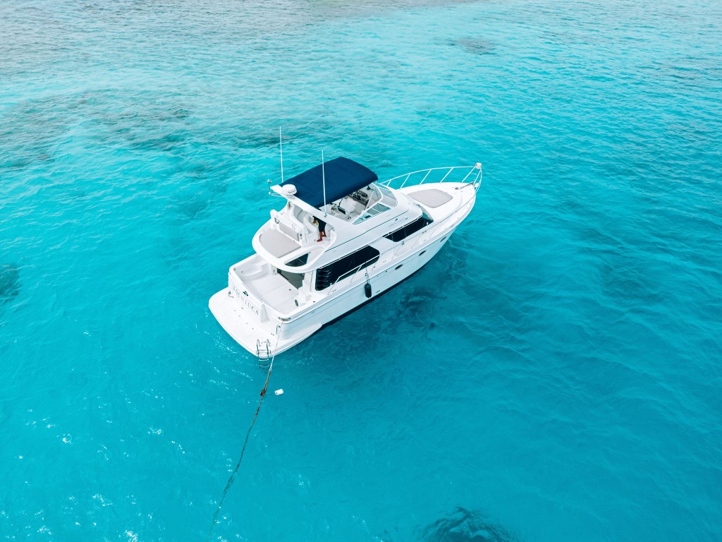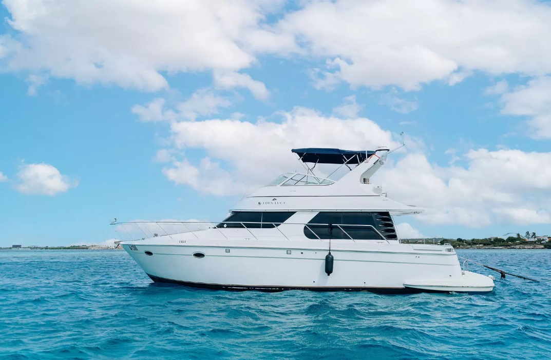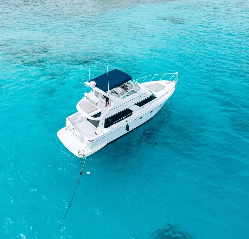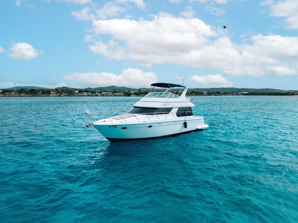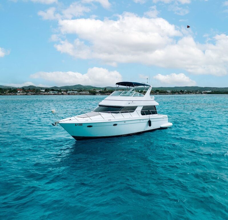 Our number one private charter in Aruba is the beautiful 45-foot yacht. This yacht has a large sunroof where you can sit around and drink your favorite cocktails, a huge mattress on the front deck where you can suntan, plenty of shade, and a comfortable, air-conditioned salon to cool off.
